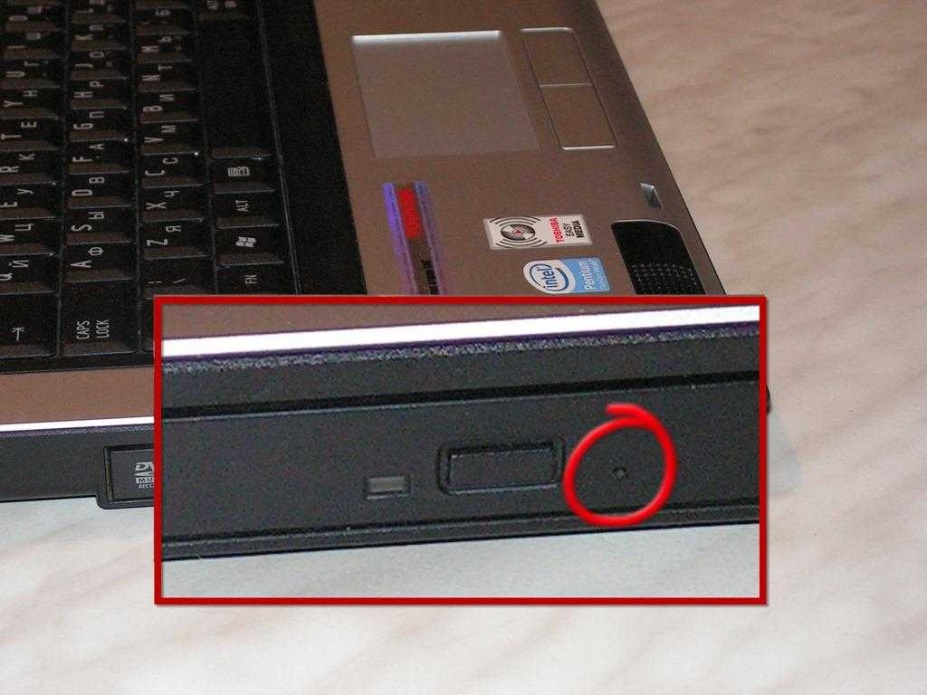 - Оптический привод извлекается из ноутбука (у большинства моделей он держится на одном винтике). Для этого нужно открыть дисковод (обычно достаточно нажатия тонкой иглой на кнопку внутри специального отверстия на панели перед кнопкой;