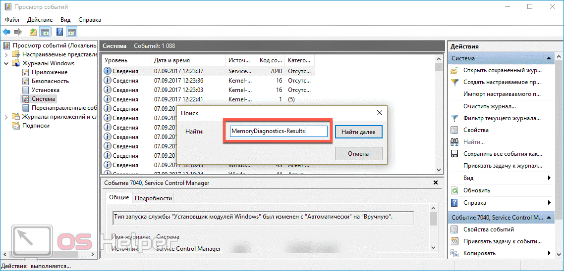 - Вводим в строку команду «MemoryDiagnostics-Results» и нажимаем на «Найти далее».