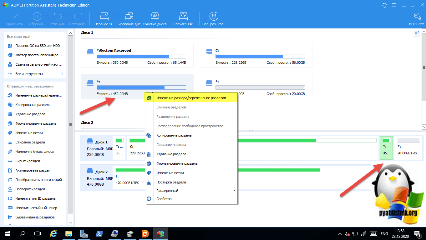 Запустите AOMEI Partition Assistant Technician Edition и выберите тот, раздел, который мы будем перемещать вправо. У меня, это Volume без буквы и размером 450 МБ. Через правый клик вызовите контекстное меню и выберите пункт «Изменение размера/Перемещение разделов».