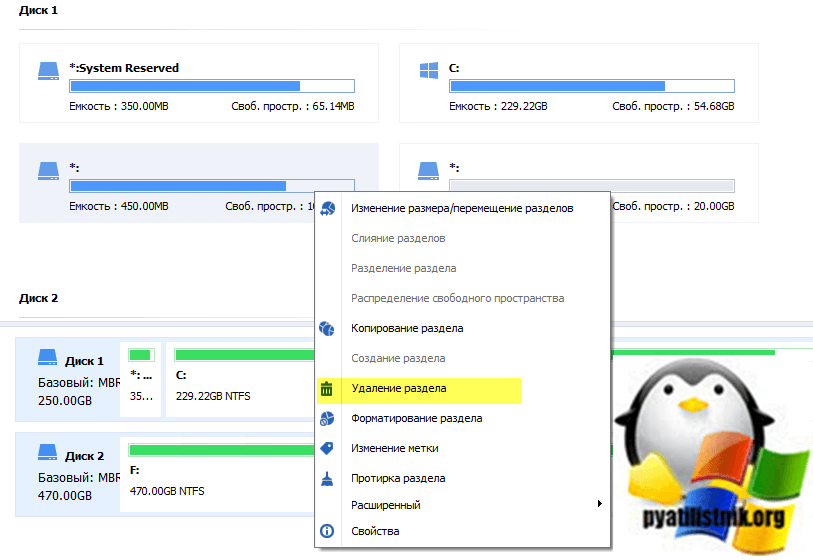 Если нужно пойти другим путем и удалить не нужный раздел, который мешает расширению тома, то так же кликните по нужному правым кликом и выберите пункт «Удаление раздела».