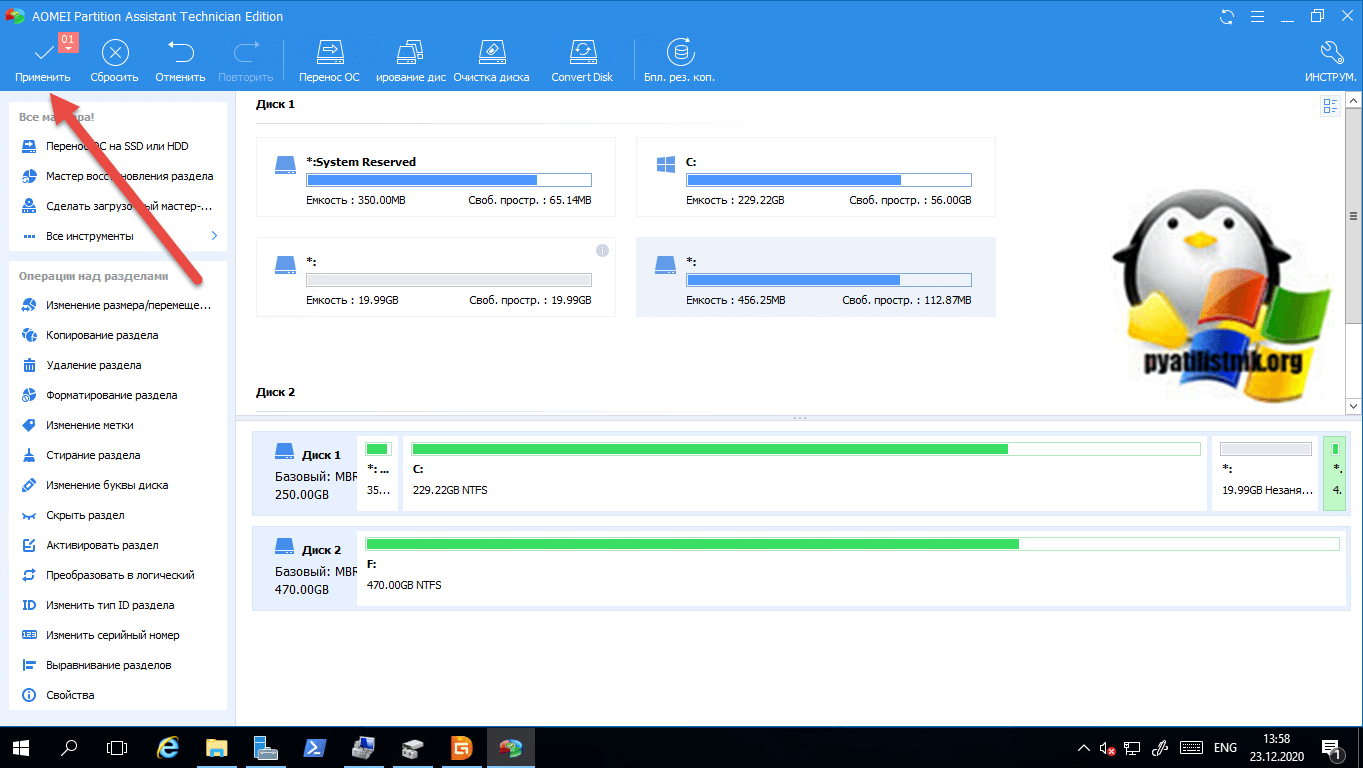 Осталось только применить наши изменения и переместить сам раздел в Windows. Для это в левом верхнем углу нажмите кнопку «Применить».