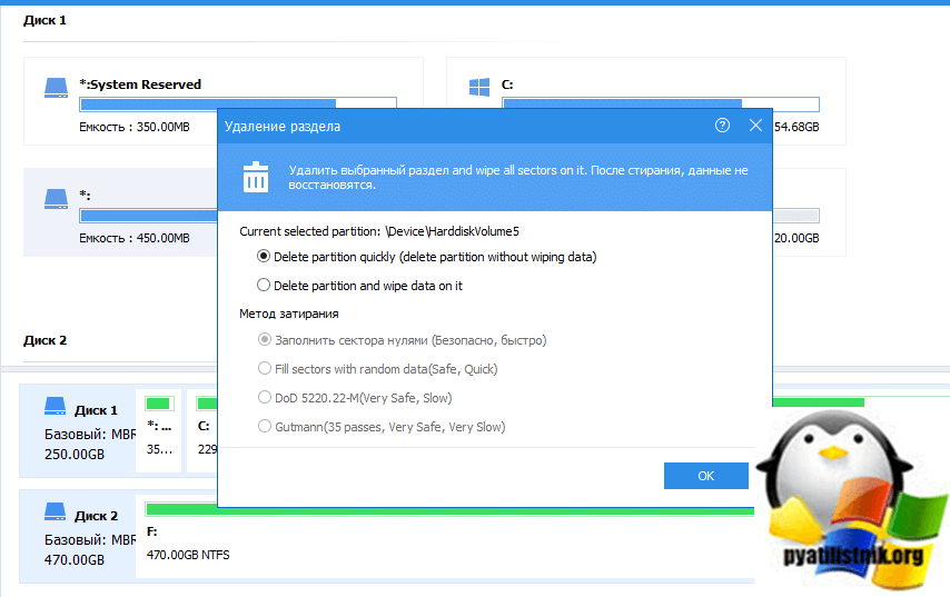 Выберите простое удаление или же с затиранием места, если нужно попараноить. После этого ваше не распределенное пространство будет перемещено левее к нужному тому и можно продолжить расширение.