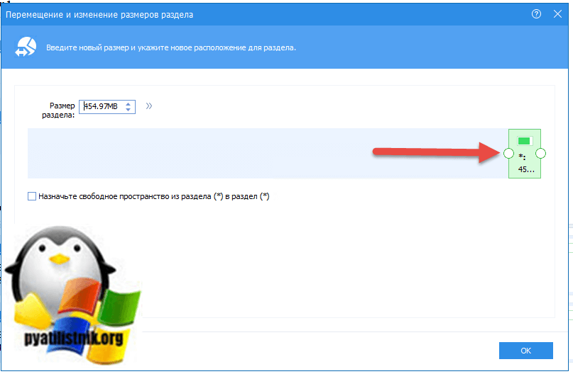 - Ползунок должен примыкать к левой части окна. Если между ним и границей окажется «пробел», возникнут проблемы с загрузкой ОС.