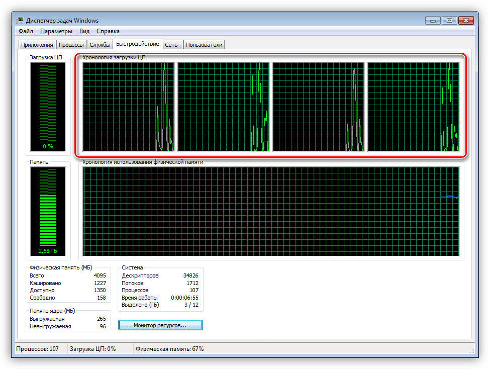 Перед вами откроется окно диспетчера задач. Откройте вкладку «Быстродействие». Здесь есть так называемая «Хронология загрузки ЦП» — посчитайте количество окон, которое означает количество ядер. Если таких окна два, значит, у вас двухъядерных процессор, если четыре — четырехъядерный и т.д.