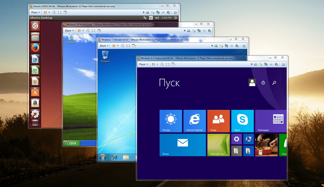 Четыре виртуальные системы, запущенные одновременно. Гипервизор — VMWare Workstation