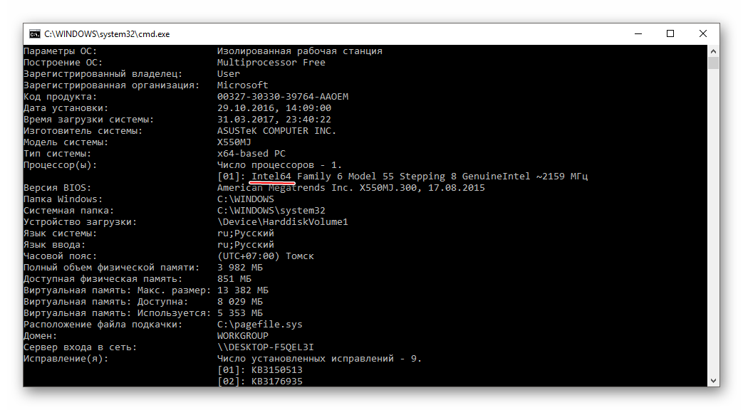 В открывшейся консоли введите команду systeminfo и нажмите Enter.
