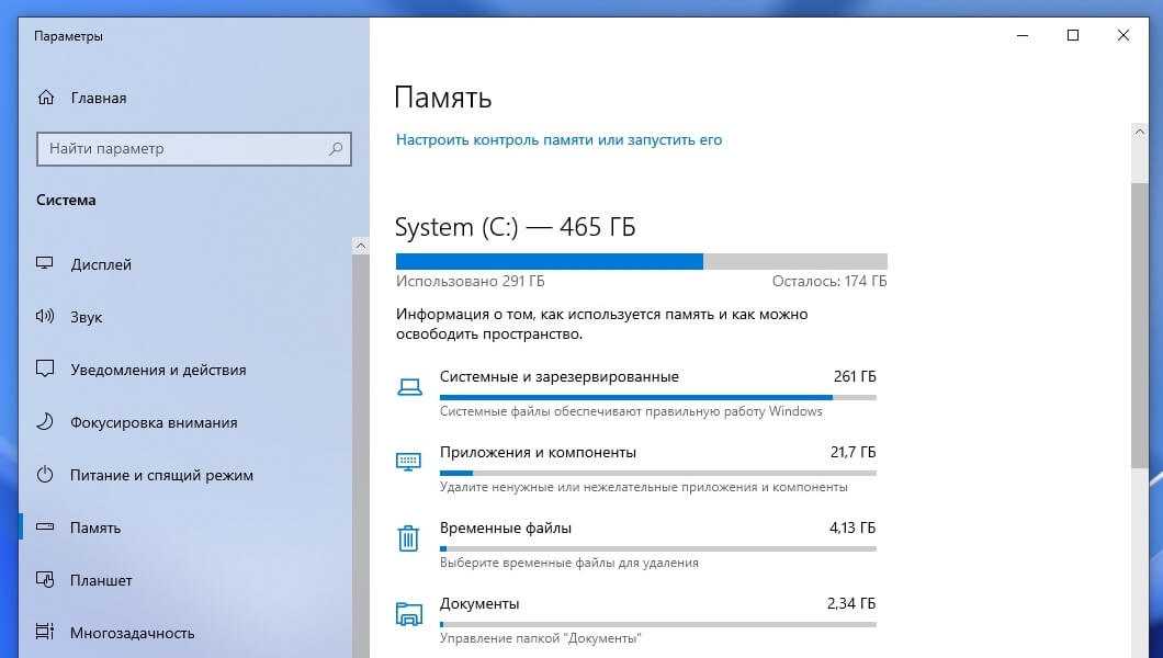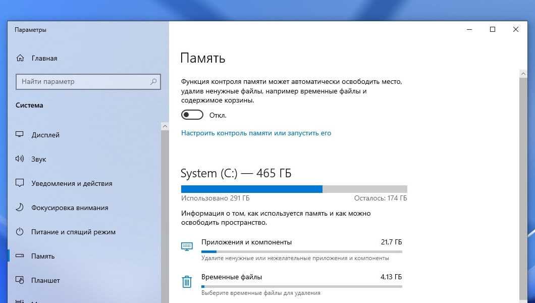 Выполните шаг № 1 из инструкции выше и нажмите на пункт «Память». В открывшемся окне вы увидите объём памяти на системном диске С — как правило, на нём устанавливают операционную систему. Здесь можно посмотреть полный объём и данные о том, как используется память.