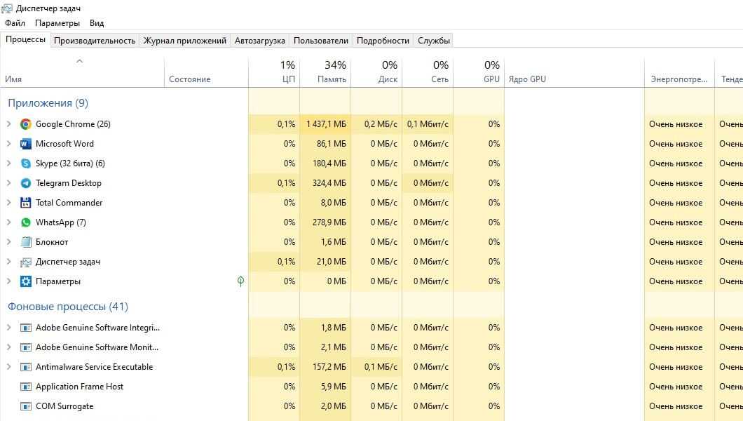 Каждое приложение на компьютере занимает не только место на жестком диске, но и оперативную память при работе. Чем больше на компьютере установлено приложений, которые используются одновременно, тем больше оперативной памяти требуется для комфортной работы. Каждая вкладка в браузере, открытые документы, картинки, мессенджеры и другие программы занимают определенный объем оперативной памяти. В «Диспетчере задач» можно посмотреть, как много свободной памяти доступно на компьютере в процессе работы и выполнения тех или иных задач.