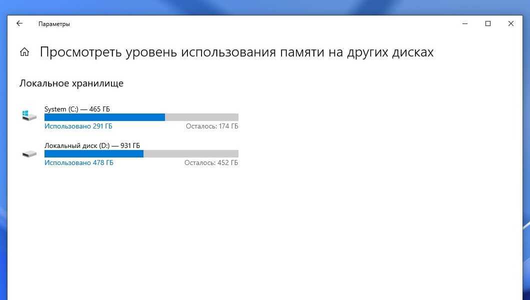 Допустим, на вашем ПК несколько дисков. Чтобы узнать объём памяти на них, нажмите пункт «Посмотреть уровень использования памяти на других дисках».
