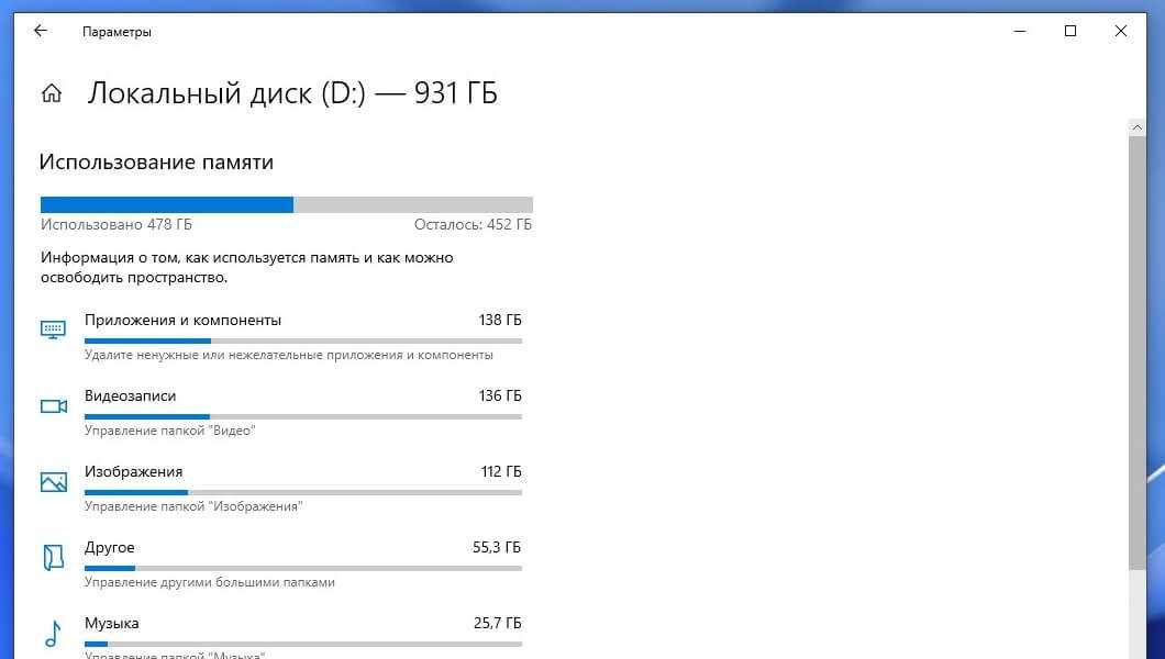 Чтобы подробно узнать, чем занята встроенная память, нажмите на строчку «Показать больше категорий». Например, так вы узнаете, сколько места занимают файлы в системных папках «Рабочий стол», «Видео» или «Музыка».