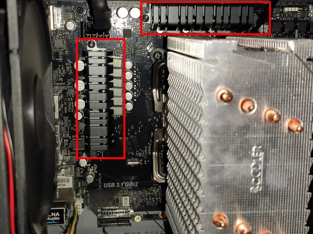 Для того, чтобы произвести измерение с помощью инфракрасного термометра, нужно для начала найти эту самую зону VRM на материнской плате. На скриншоте искомые зоны отмечены красным цветом (для материнской платы ASRock B450 Pro4):
