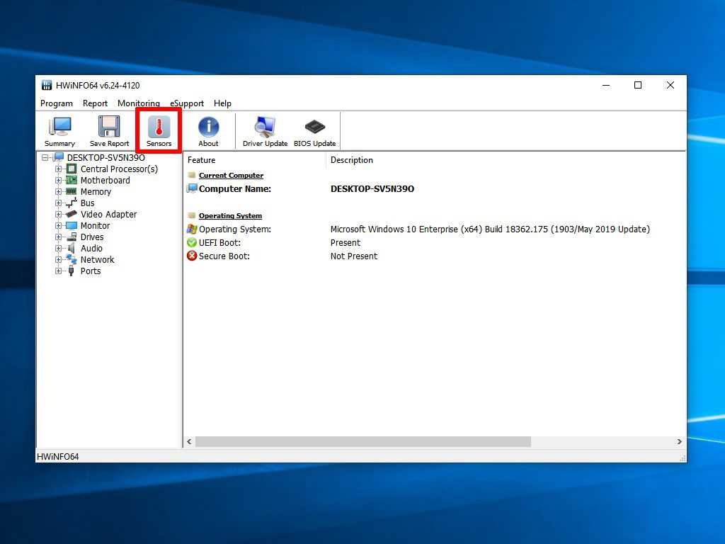 Установив и запустив утилиту HWiNFO64, перейдите на вкладку Sensors, нажав на одноимённую кнопку на панели инструментов: