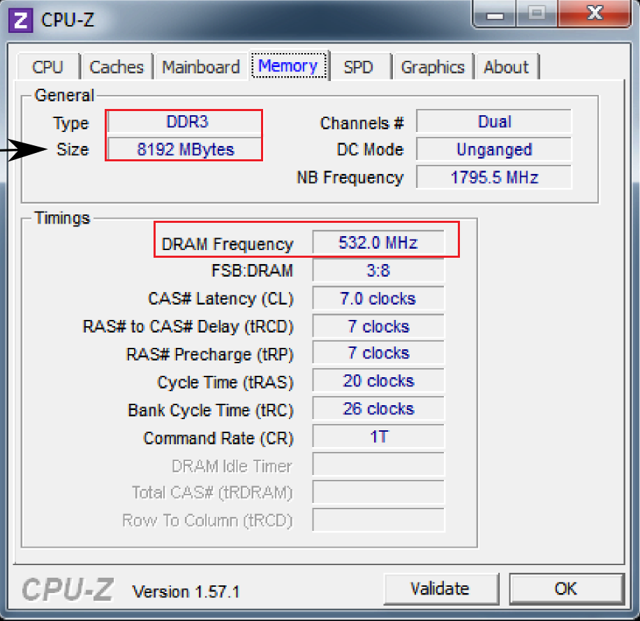 Рис.7. Тип и размер ОЗУ, а также частота её шины с помощью программы CPU-Z.