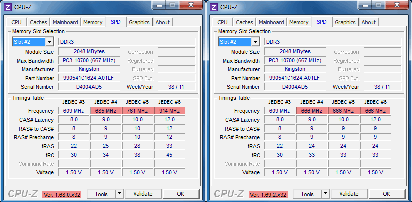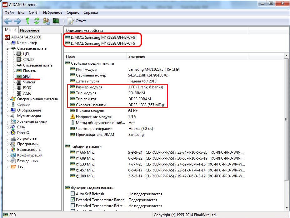 и включают такие характеристики как имя модуля, объём и тип, частота, вольтаж, тайминг и серийный номер.