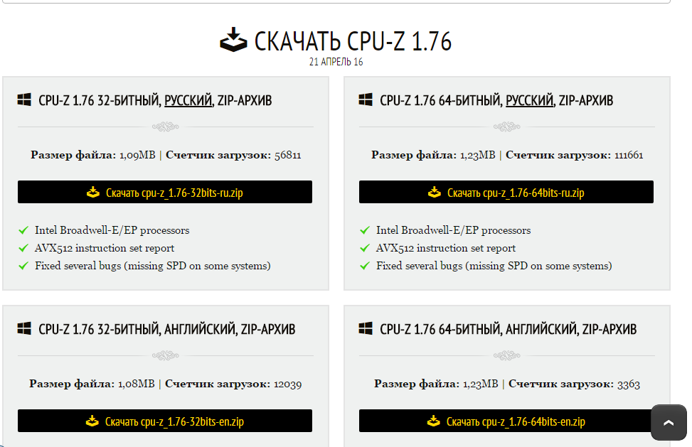 Рис.6. Список дистрибутивов приложения CPU-Z на сайте производителя.