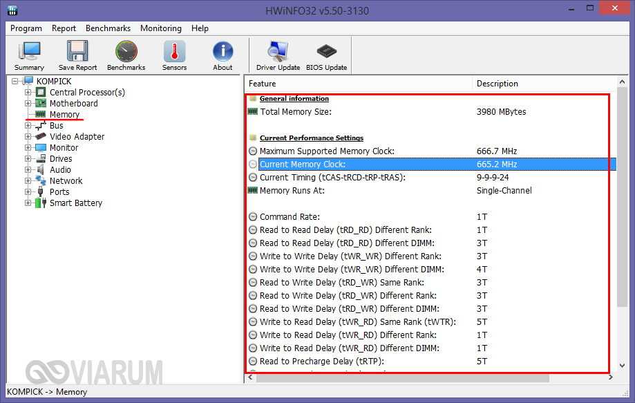 . Внешне и функционально она чем-то напоминает AIDA64 и в то же время CPU-Z. На вкладке «Memory» программа показывает тип модуля, объём в мегабайтах, режим канала (одно-, двух- или трёхканальный), тактовую частоту, тайминг и прочие дополнительные сведения. HWiNFO64-32 бесплатна, язык интерфейса имеет английский, что, как и в случае с CPU-Z, не является принципиально важным.
