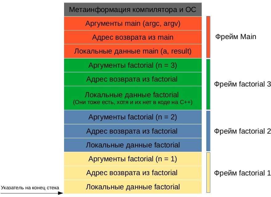 Стек при вызове последней рекурсивной функции будет выглядеть следующим образом: