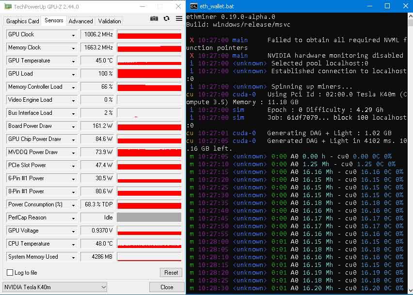 В операционных системах с ядром Linux безо всяких ухищрений прошитая видеокарта Тесла К40 выдает больше 19 MH/s (xubuntu 18.04, ethminer 0.19.0.10):