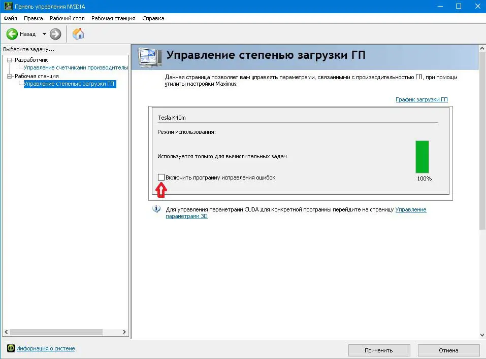 Дополнительно увеличить производительность видеокарт Tesla K в Windows можно, отключив error correction в программе NVIDIA Control Panel: