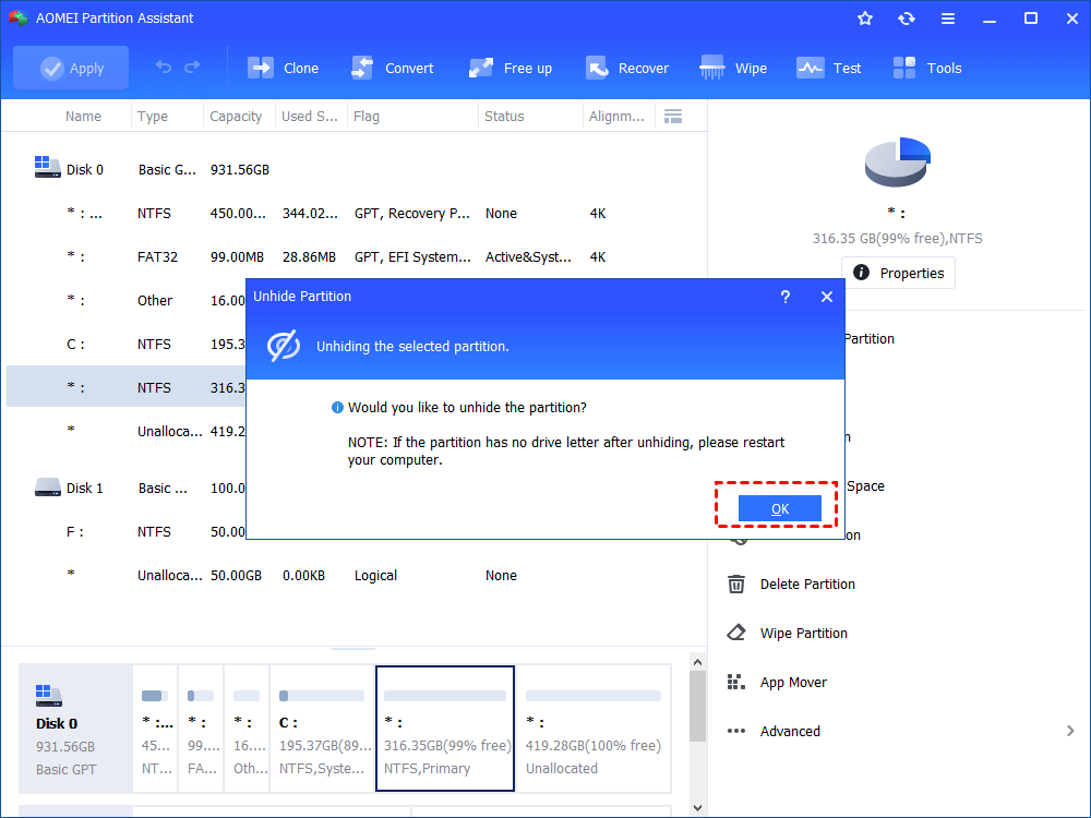 Unhide Partition: right click the hidden partition and select Advanced, and then Unhide Partition. Follow the wizard to complete.