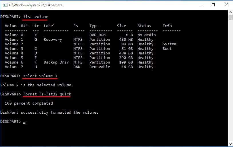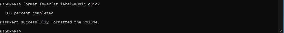 • format fs=fat32 quick (you can replace “fat32” with “ntfs” or “exfat” as well)