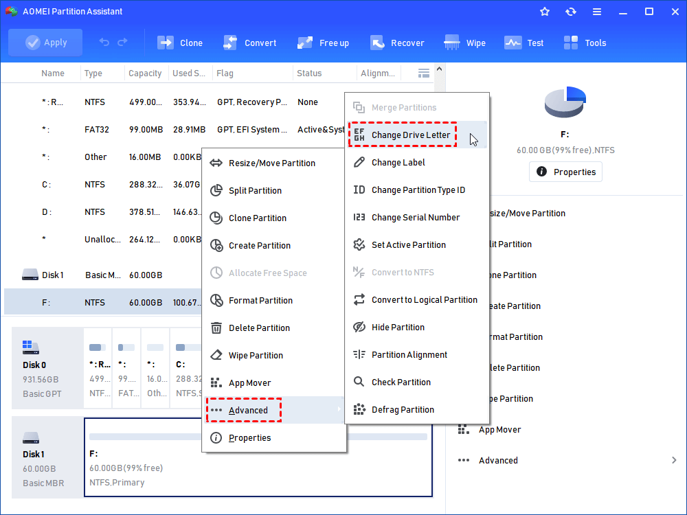 Assign Drive Letter: right click the partition you want to and select Advanced, and then Change Drive Letter. Select the new drive letter from the drop-down menu in the pop-up window, and click OK.