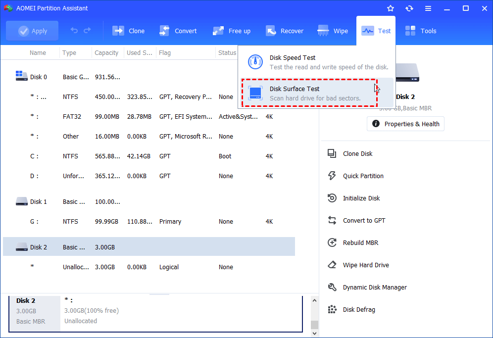 Check Disk: to check the status of the entire disk, right click the disk and select Surface Test. Follow the wizard to complete.