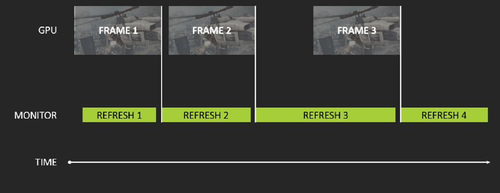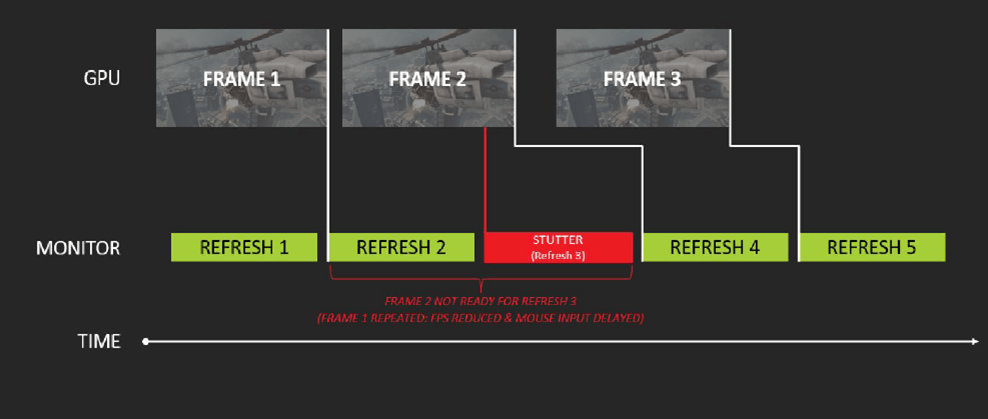 Как работает: изредка бывает второй кадр опаздывает к выходу на экран. Видеокарта не успевает отрендерить кадр и он отображается с искажениями или вовсе пропускается. Вам отображается первый кадр, а второй всё ещё задерживается на единицу обновления экрана.