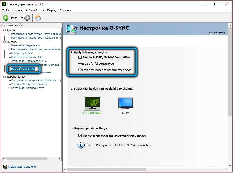 Включение режима осуществляется через фирменное ПО Nvidia Control Panel. Нужно зайти во вкладку Display, выбрать пункт Set up G-SYNC, после чего для параметров Enable G-SYNC, а также G-SYNC Compatible установить полноэкранный режим (Enable for full screen mode).