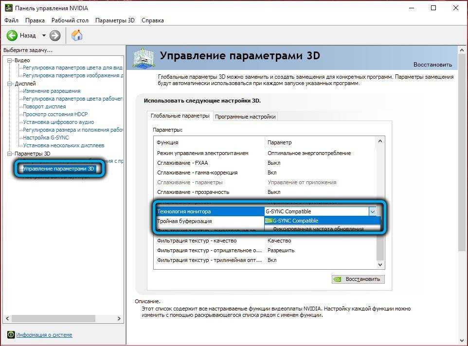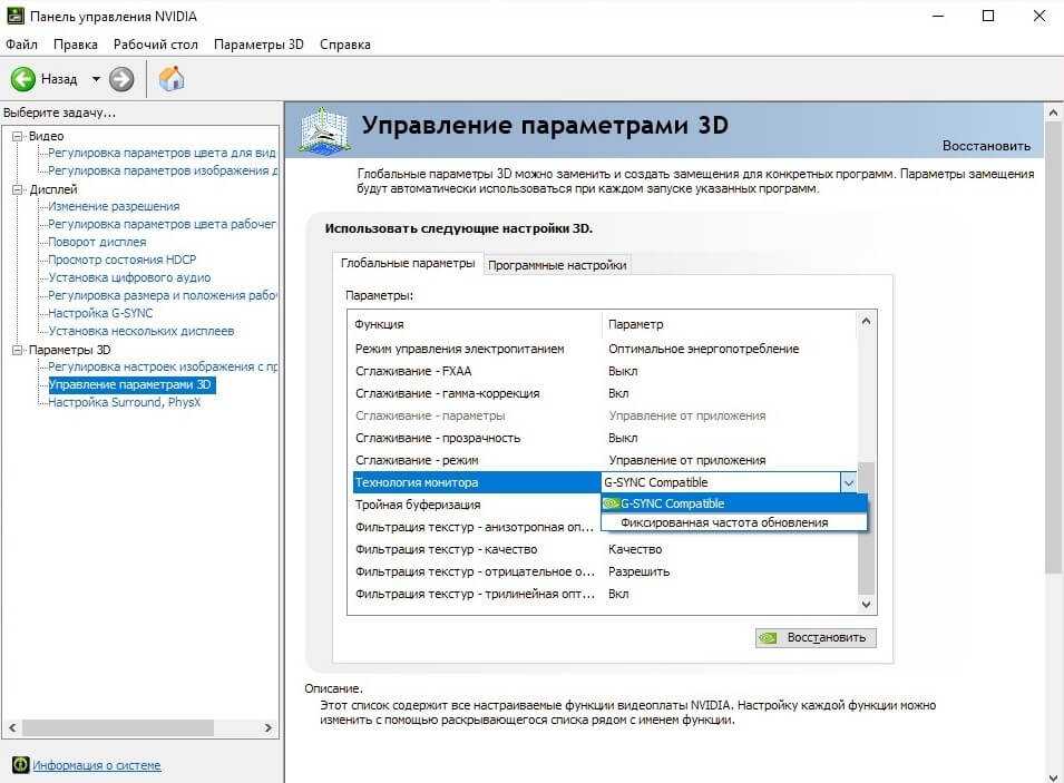 Можно включить совместимость AMD FreeSync на видеокартах NVIDIA. Откройте Параметры 3D > Управление параметрами 3D и выберите Технология монитора на G-SYNC Compatible.