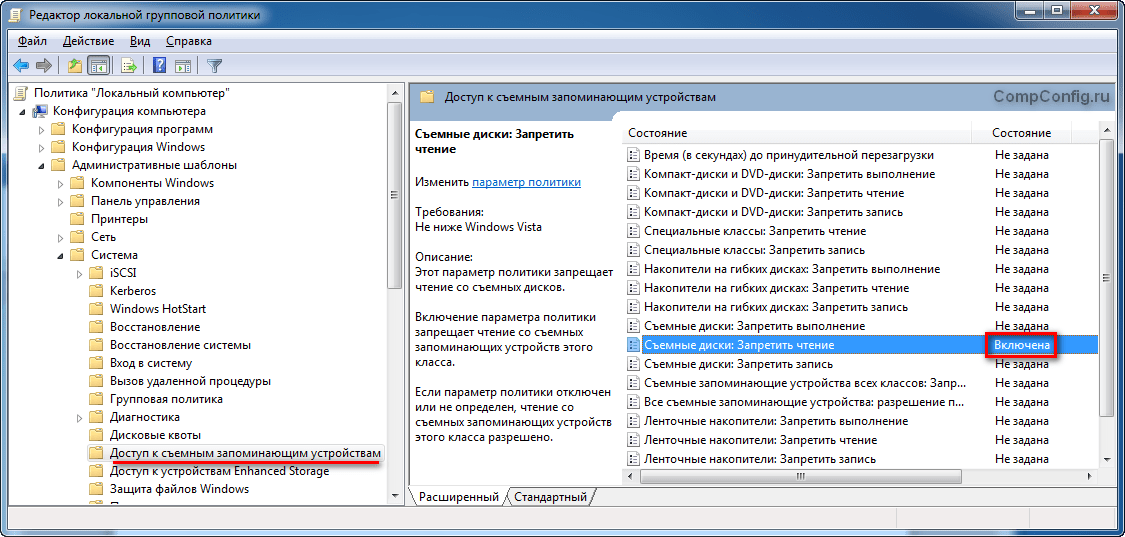 - В правой части экрана найдите пункт «Съемные диски: Запретить чтение».