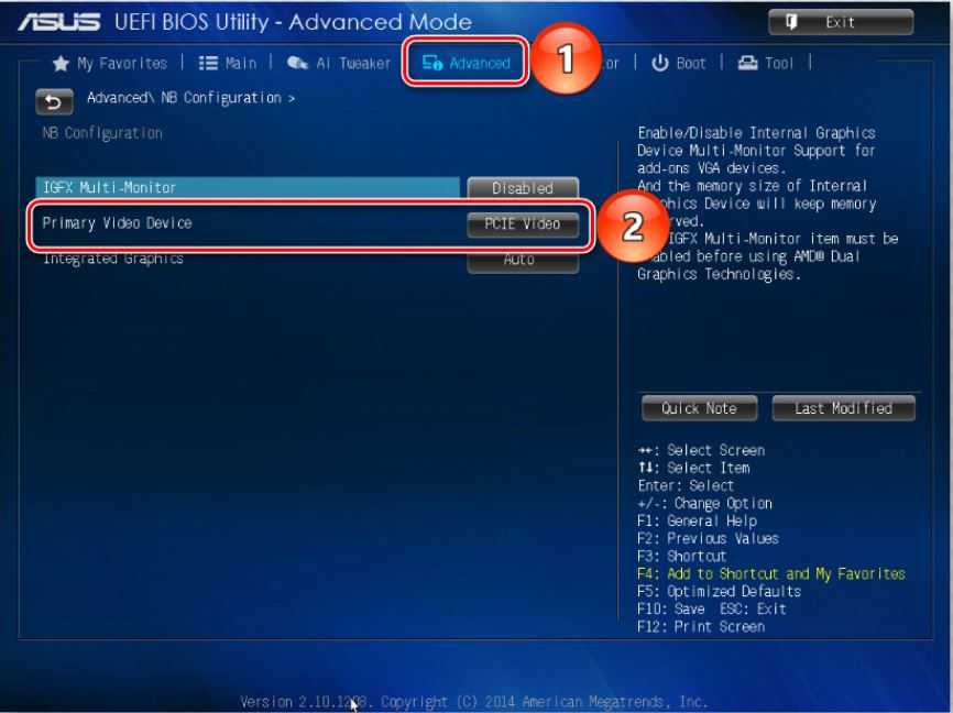 В UEFI BIOS настройки графики обозначены как «Primary Display» или «Init Display First» в разделе, конфигурирования материнской платы.