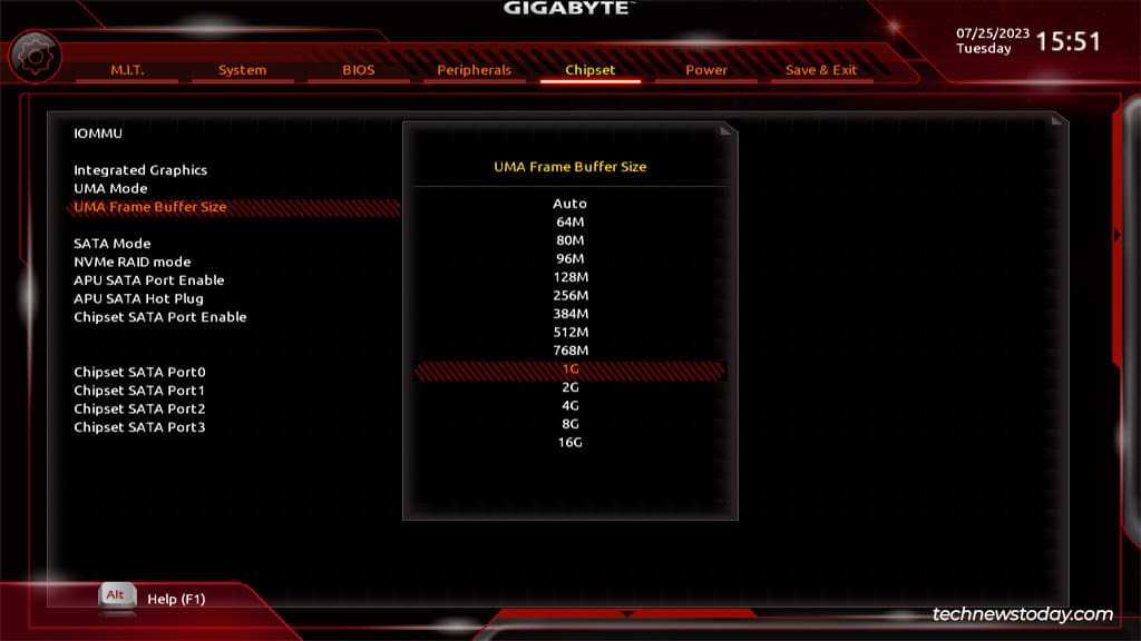 Before saving the changes (F10), make sure you haven’t overallocated memory to the UMA buffer to the point where your overall system performance may be compromised. For instance, allocating 2GB on a system with 8GB RAM is fine, but doing so on a system with 4 GB RAM is a bad idea.