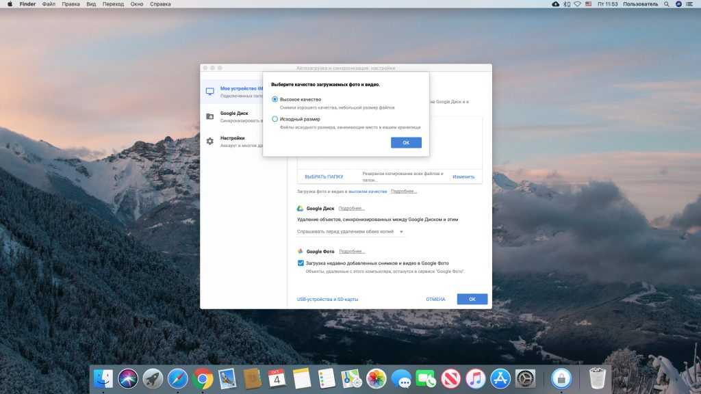 Во‑вторых, сохраняйте ваши картинки в Google Photo. Фото до 16 Мп, конечно, будут ужиматься. Но всё равно качество будет оставаться приемлемым, а место для их хранения не будет учитываться. Включить сжатие фотографий можно на странице настроек. Либо откройте настройки клиента «Автозагрузка и синхронизация», щёлкните на «Загрузка фото и видео в исходном качестве» и выберите вариант «Высокое качество».