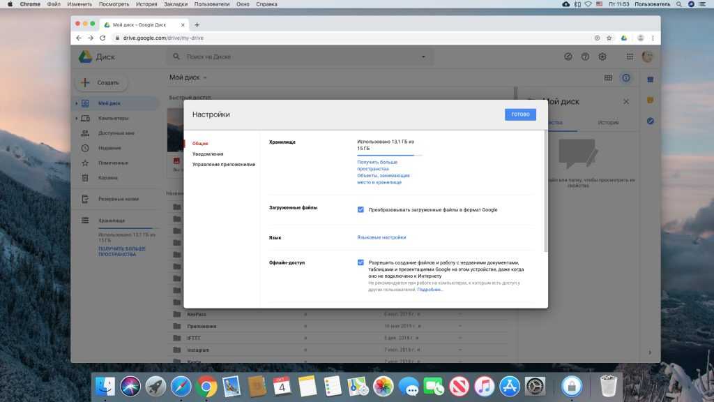 Предпочитаете работать с «Google Диском» в браузере? Откройте страницу настроек и включите опцию «Офлайн‑доступ». Вам будет предложено установить расширение «Google Документы офлайн», сделайте это. Теперь вы сможете редактировать документы, таблицы и презентации без доступа к Сети. Правда, это работает только в Chrome.