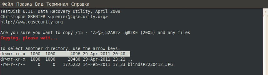 Отсюда же можно попробовать скопировать особо важные файлы и папки, особенно если боитесь, что данные не восстановятся, а наоборот потеряете последнюю, пусть даже и битую информацию. Для примера я буду копировать музыкальный альбом. Выделяем нужное курсором, нажимаем С для копирования. Появляется файловый менеджер, где можно выбрать куда будем копировать. В домашнем каталоге для этих целей специально создана папка Restored.