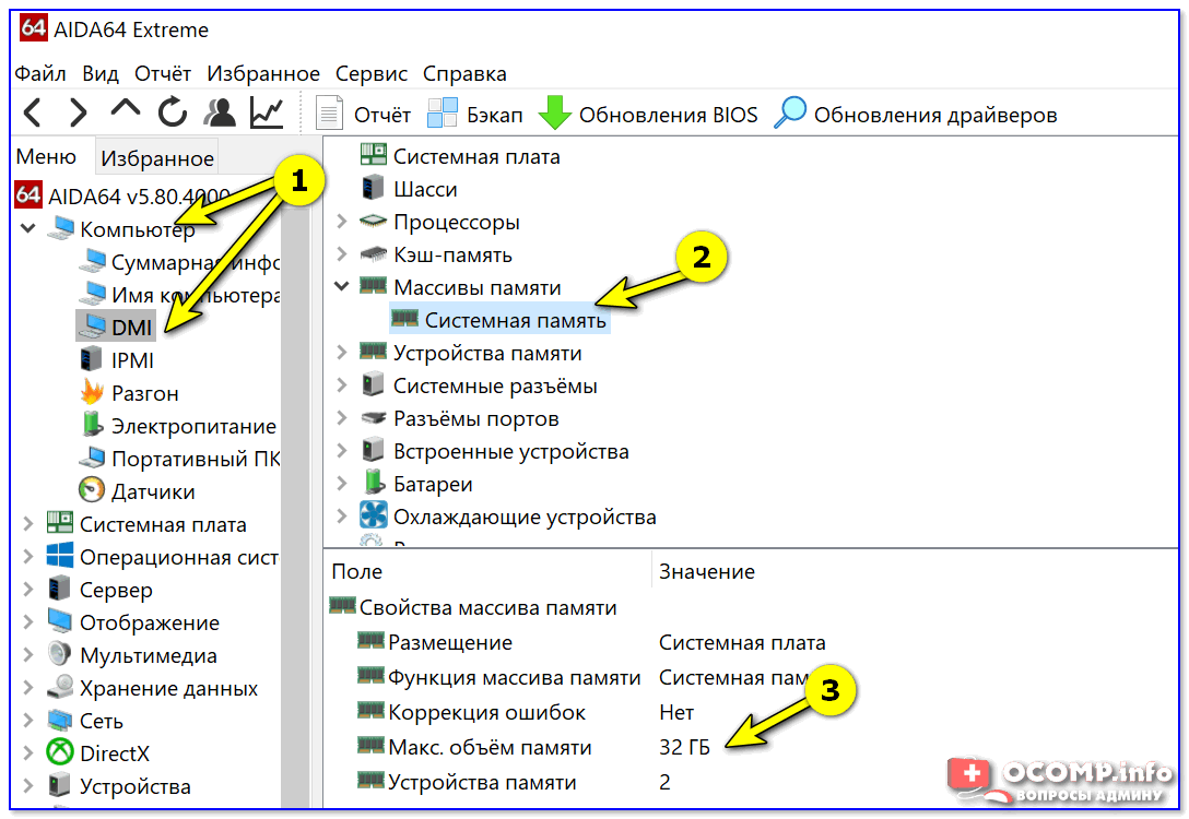 Кстати, если макс. объем во вкладке «Чипсет» не отображается — попробуйте открыть «Компьютер/DMI/Массивы памяти/Системная память» . Как правило, в этой вкладке эта информация дублируется.