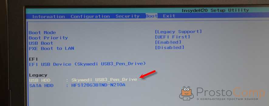Обратите внимание, что точная комбинация может отличаться в зависимости от модели ноутбука. В BIOS найдите раздел «Boot» (Загрузка) и выберите свой USB-накопитель в списке загрузочных устройств