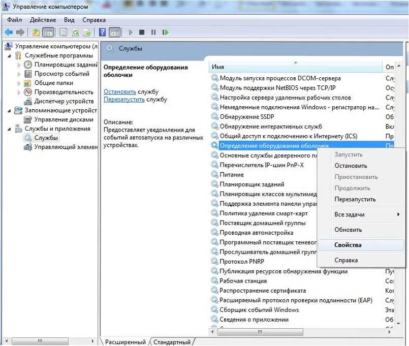 В левой части нового окна выбираем раздел «Службы». А в правой, среди списка служб, находим «Определение оборудования оболочки». Теперь кликаем правой кнопкой по данной службе и нажимаем на «Свойства».