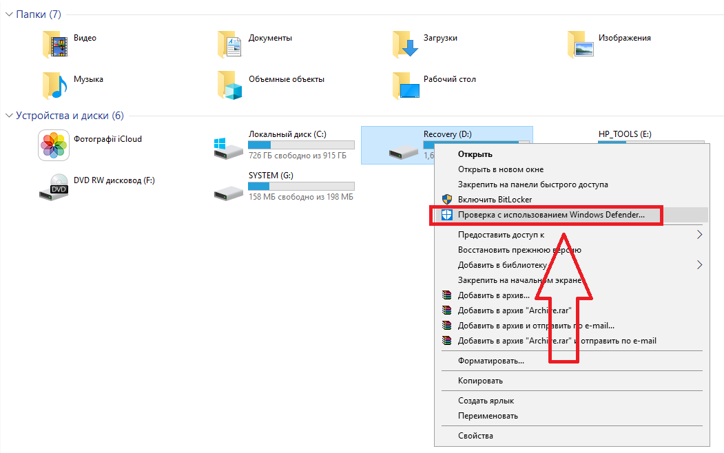 Одним из самых актуальных способов решения рассматриваемой проблемы также является сканирование носителя на заражение вирусами. Для этого вам понадобится зайти в «Мой компьютер» и нажать правой клавишей мышки на присвоенное девайсу операционной системой имя, например, «Диск Z».