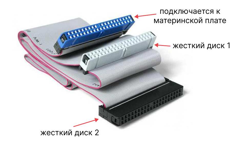 Наглядный пример интерфейса применительно к HDD-дискам — это IDE (Integrated Drive Electronics), или ATA (Advanced Technology Attachment). Условно это простой способ подключения жесткого диска к материнской плате через шлейф из 40 или 80 жил.