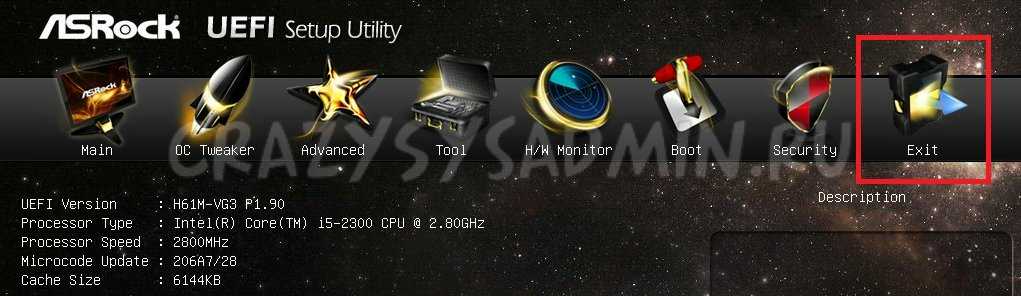 Стрелками клавиатуры (влево, вправо) переходим во вкладку верхнего меню под названием «Exit».
