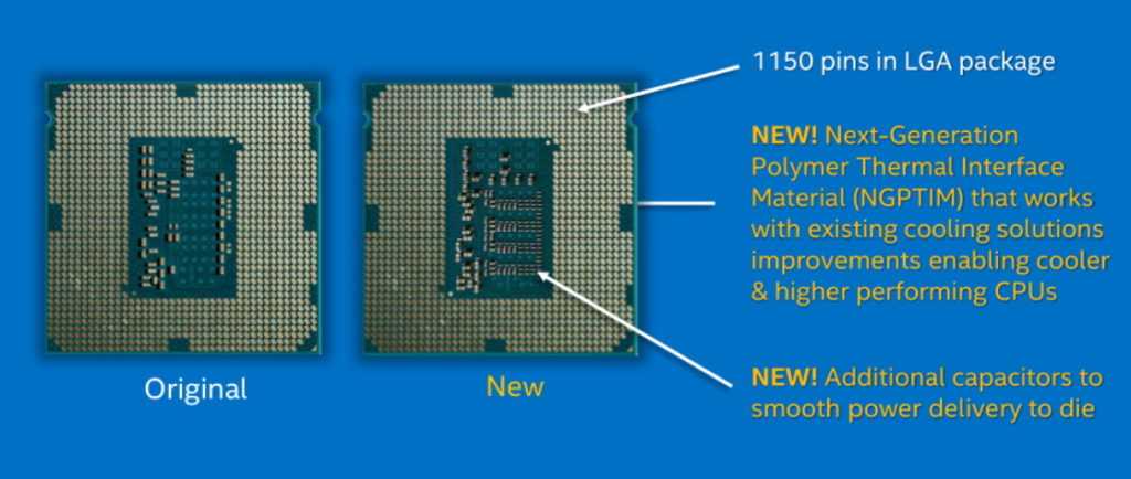 Еще одно изменение — на днище процессора появились дополнительные конденсаторы, что, по заявлению Intel, способствует улучшению стабильности питания процессора.