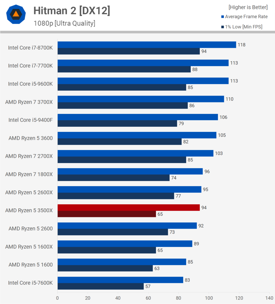 Игра Hitman 2 также смотрится на этом процессоре в выгодном свете. При этом нижняя производительность страдает сильнее, чем у процессоров с 8 и 12 потоками команд. Производительность сопоставима с Ryzen 5 2600, по крайней мере, на разрешении 1080p.