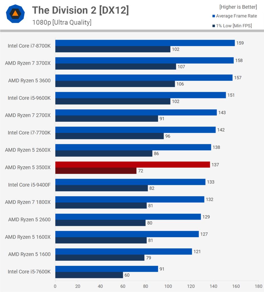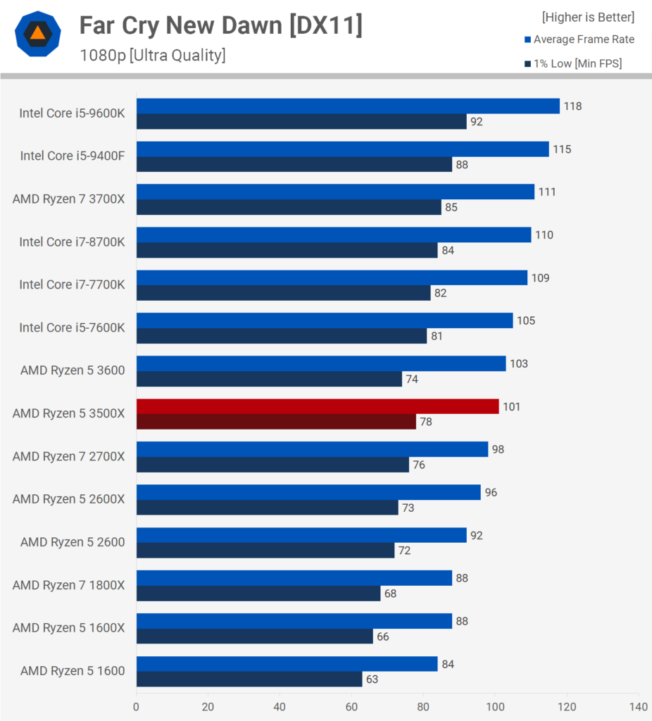 Far Cry New Dawn нагружает процессор меньше протестированных выше игр. Неудивительно, что 3500X показывает неплохую минимальную производительность, даже превосходя 3600. Общая производительность такая же, ненамного опережает Ryzen 2-го поколения.