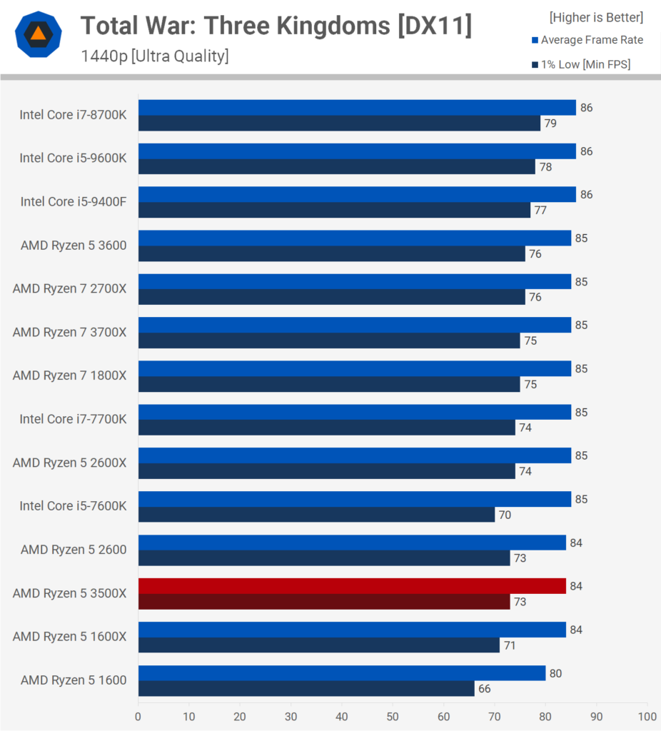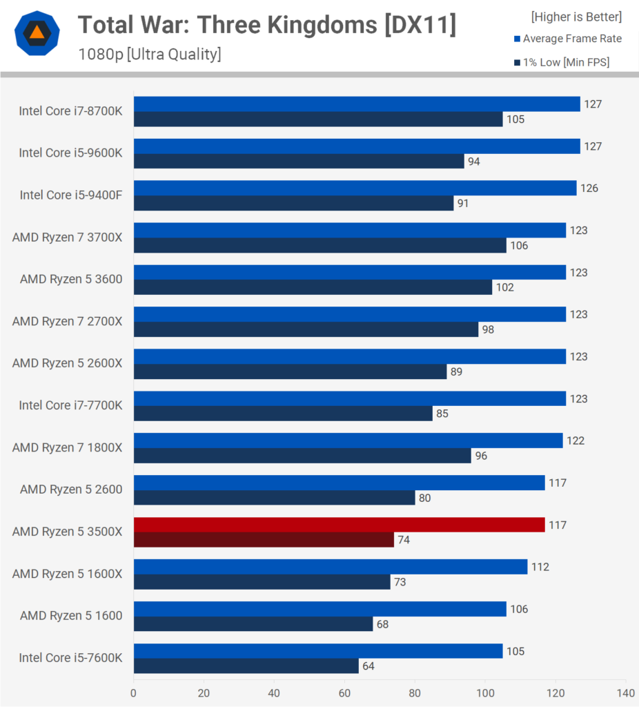 Наконец, в игре Total War: Three Kingdoms 3500X находится на уровне с Ryzen 5 1600X, а 3600 намного лучше по нижним результатам. Здесь 3600 почти на 40% быстрее, поскольку поддерживает SMT.