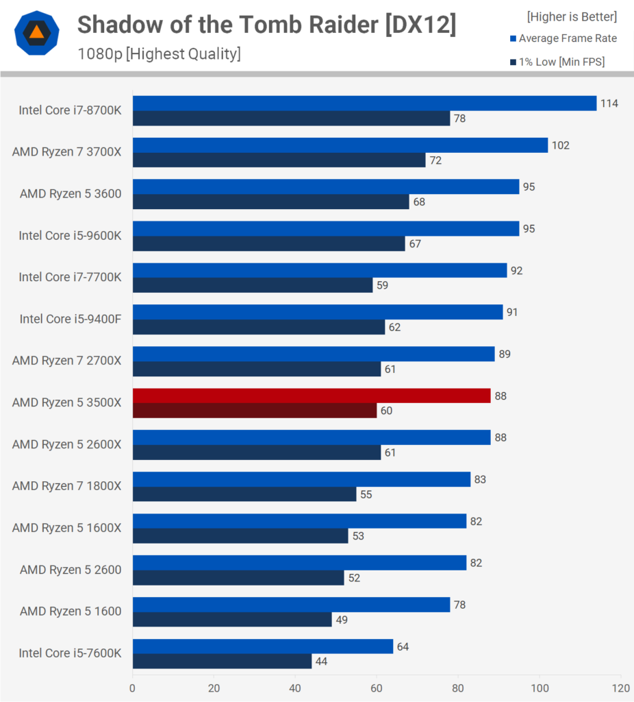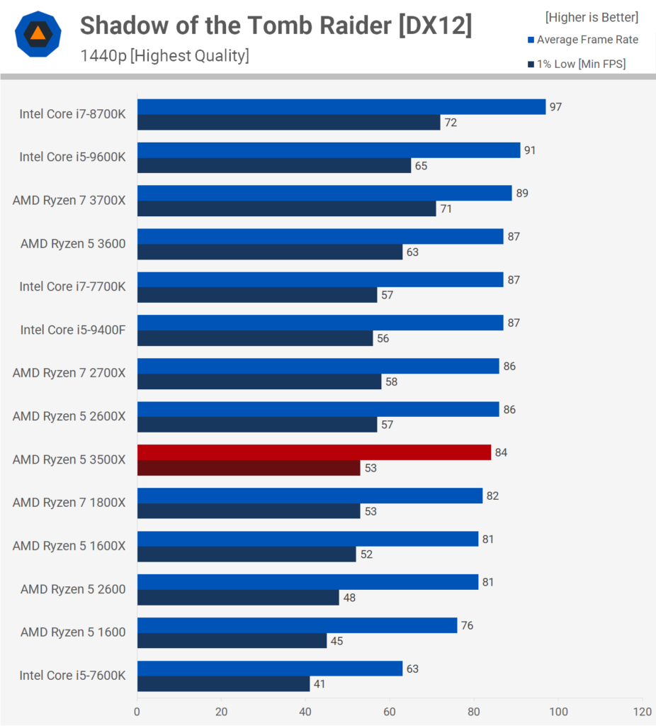 В игре Shadow of The Tomb Raider нагрузка на центральный процессор не такая большая, как в двух предыдущих. В результате 3500X выступает неплохо. Он показывает результаты на уровне 2600X и 9400F.