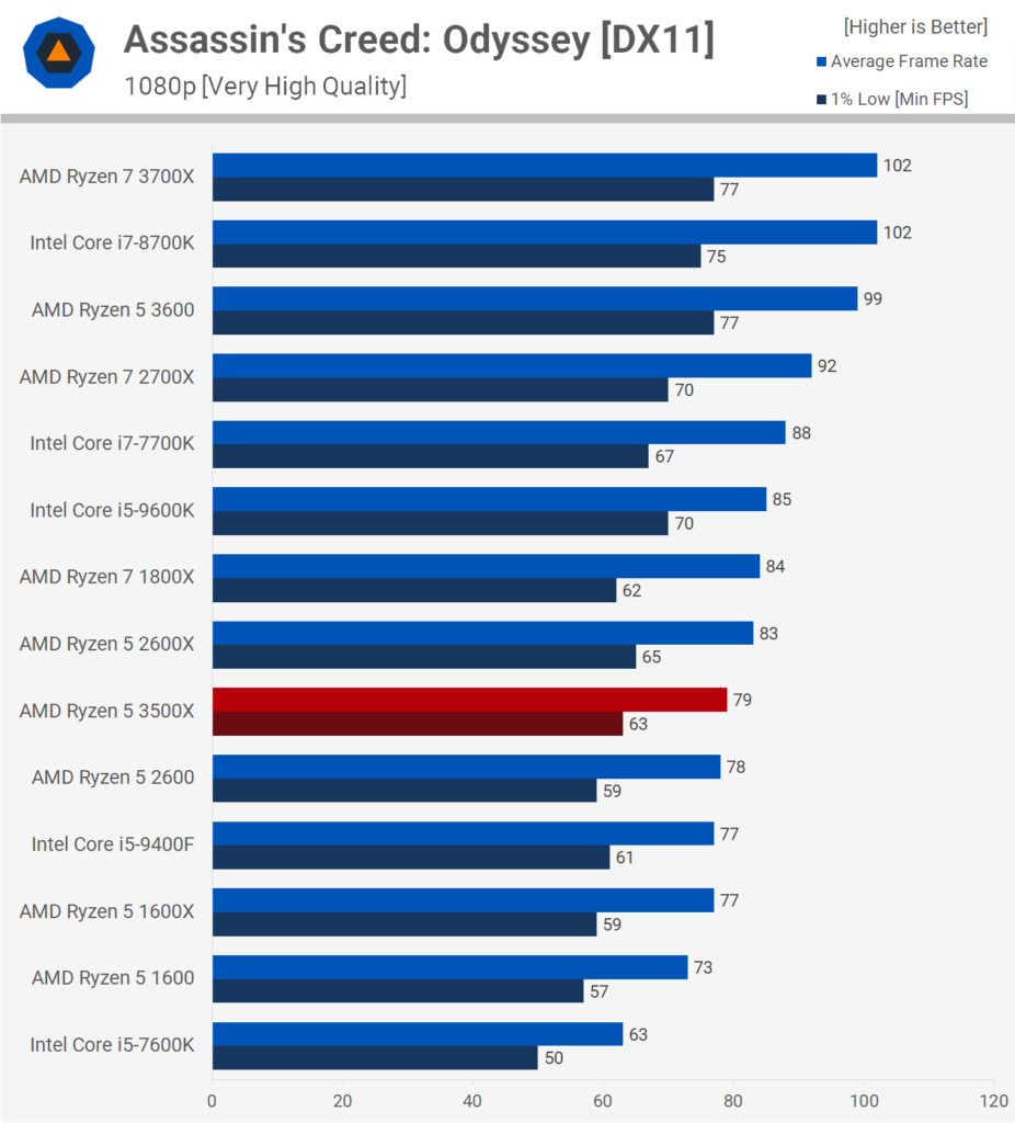Здесь 3500X сопоставим с Core i5-9400F и с первыми двумя поколениями Ryzen 5. Это означает хорошую производительность, но вряд ли пройдёт много времени, прежде чем этой производительности 6-ядерным процессорам вроде 3500X и 9400F в играх станет не хватать.