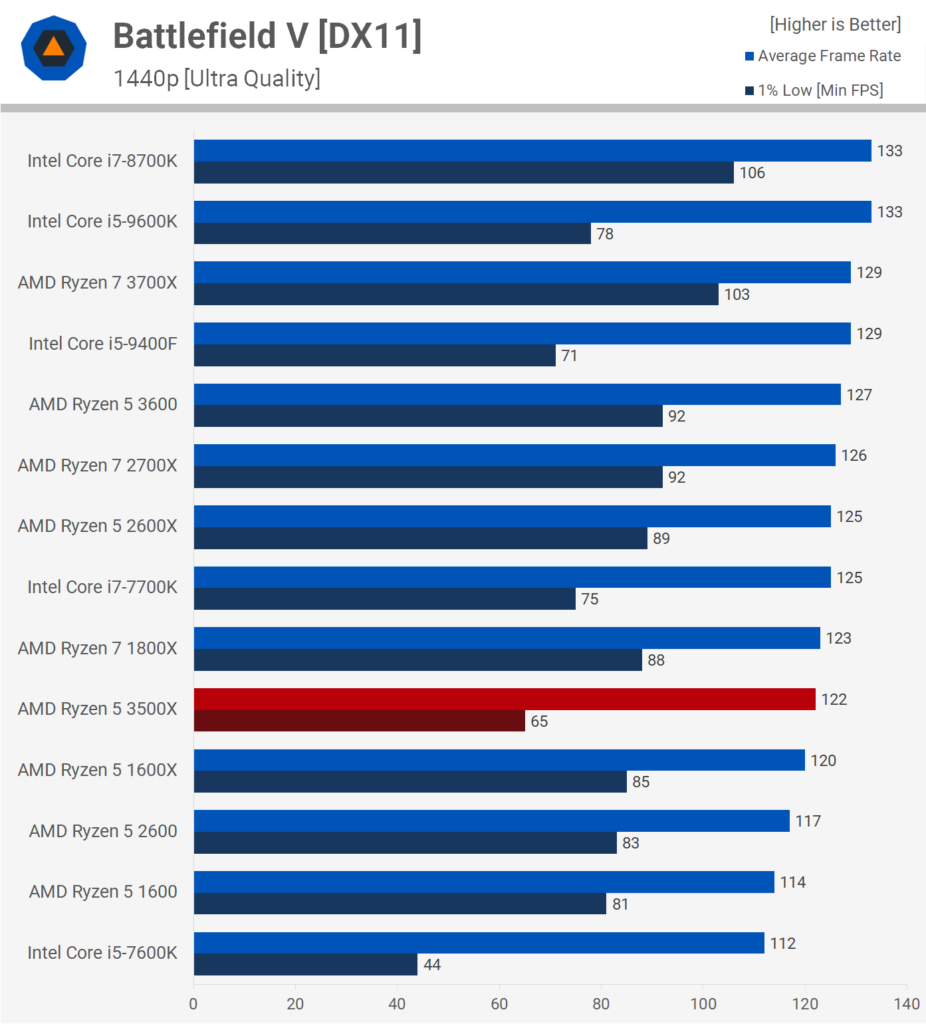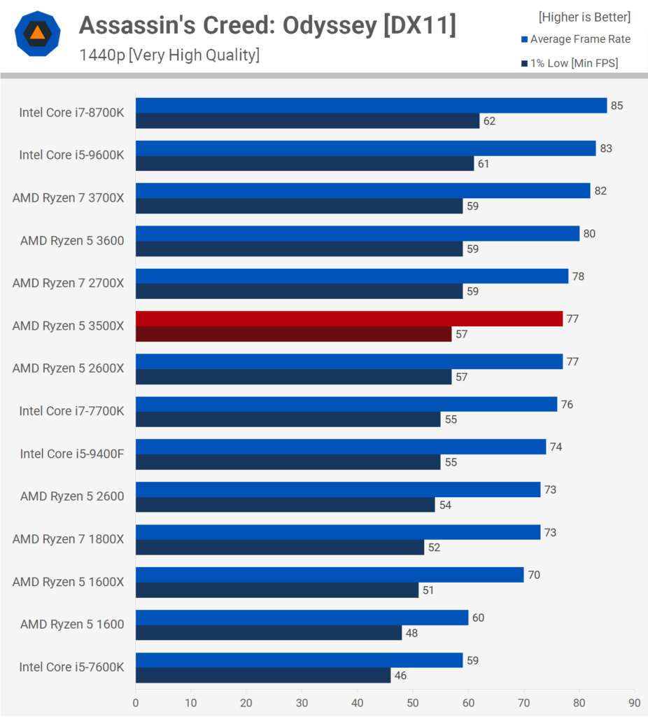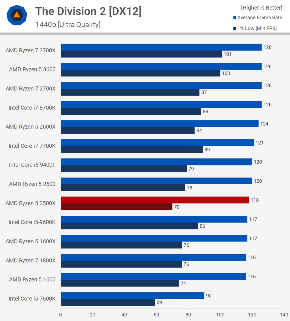 На разрешении 1440p видеокарта является самым важным фактором, поэтому вся разница нивелируется, и 3500X ничуть не уступает другим процессорам на графиках. Только R5 1600 немного отстаёт.