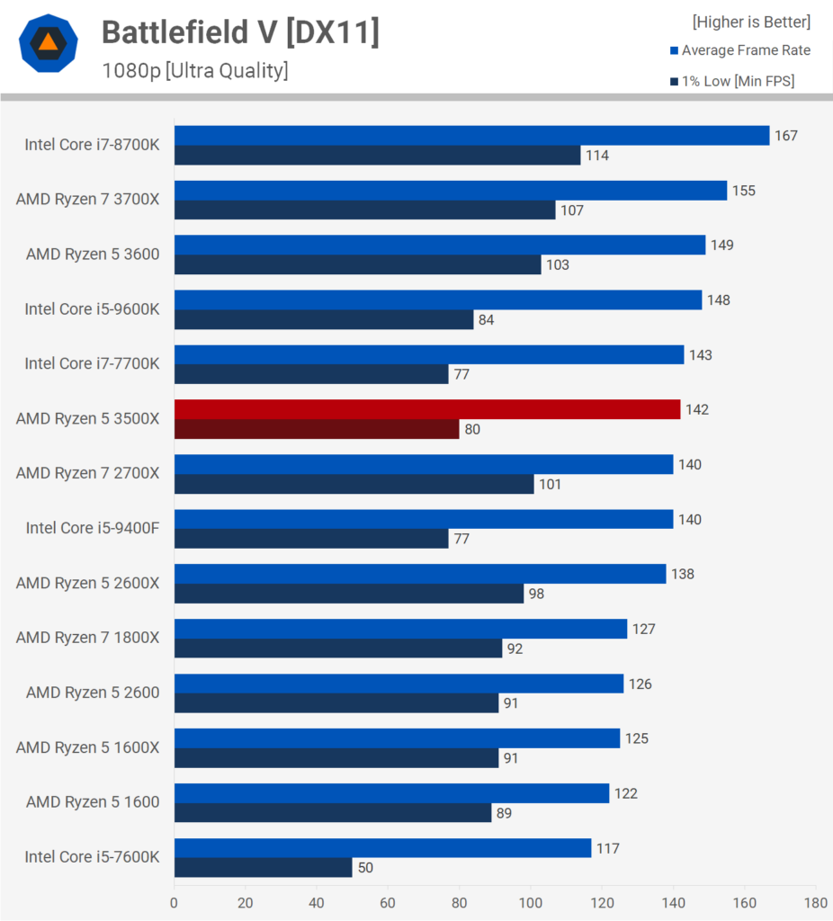 В игре Battlefield 5 мы видим, что 6 и даже 8 потоков уже недостаточно. Здесь 3500X выдаёт производительность на уровне Core i7-7700K и Core i5-9400F. Хотя средняя частота кадров выглядит неплохой, нижний 1% производительности страдает больше.